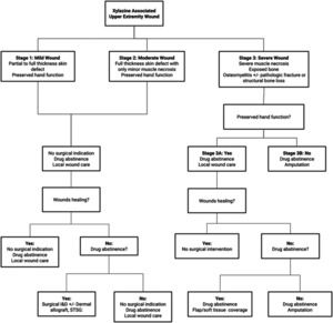 Xylazine-associated wounds can be classified based on tissue destruction severity to guide treatment decisions and potentially predict outcomes.10,11 Tosti et al. have previously presented a xylazine-associated wound treatment algorithm formulated by senior author Criner-Woozley KT and adopted by the members of this consensus paper,10,11 which is coined “The Philadelphia Treatment Algorithm for Xylazine Wounds” [Figure 1].