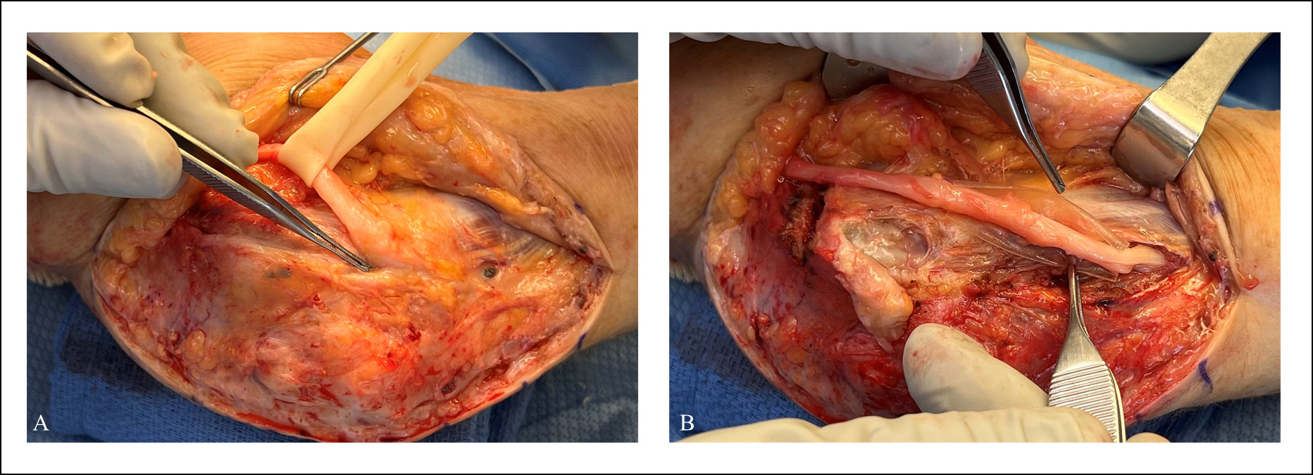 With institutional review board approval, all patients that received the AxoGuard™ PEM nerve wrap between February 2016 through March 2023 at a single orthopaedic practice were identified by implant records. Patients were excluded if the procedure was not conducted on the hand or upper extremity, was not performed by a hand surgery fellowship-trained orthopaedic surgeon, or if patient records did not clearly state the application of the nerve wrap. A retrospective review of the patient’s electronic medical record was performed. Patient demographics, pre-operative exam, and testing, history of present illness, intra-operative findings, and complications were recorded. The decision to utilize the PEM nerve wrap was made by the operative surgeon at the time of the procedure based on intra-operative findings.